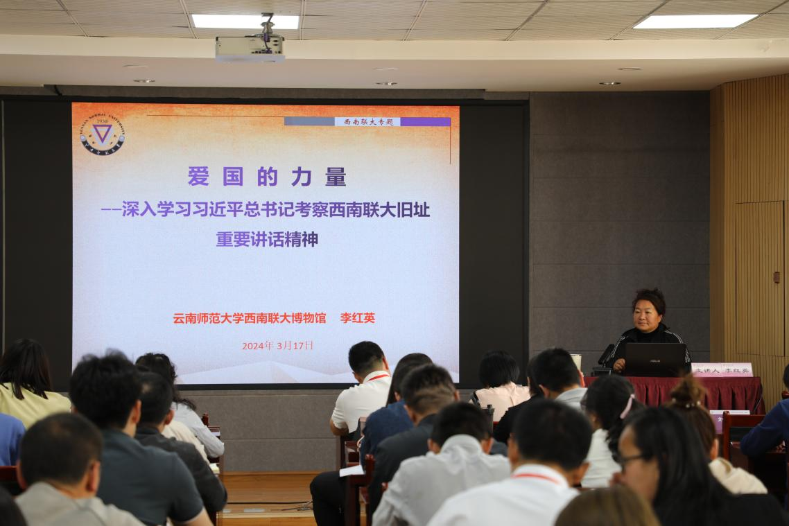 在主题党日活动上,西南联大博物馆李红英馆长为学员作“爱国的力量——深入学习习近平总书记考察西南联大旧址重要讲话精神”专题辅导。大家深刻领悟习近平总书记考察西南联大旧址重要讲话的核心内容、精神实质以及实践要求。通过学习,习近平总书记考察西南联大旧址的每一帧动情画面、每一句谆谆教诲,更加深刻地镌刻在每一位学员心中。