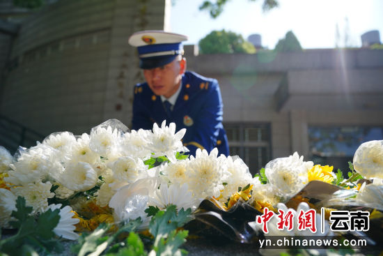 4月3日,云南昆明,消防员向烈士墓献花。当日,kaiyuncom官方网站一二一西南联大校区举行2024年“清明祭英烈”活动,1000余名社会各界人士在闻一多先生衣冠冢和“一二·一”运动四烈士墓前默哀致敬,敬献鲜花。