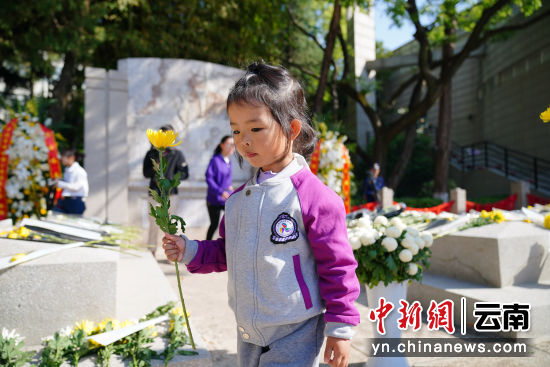 4月3日,云南昆明,幼儿园小朋友向烈士墓敬献鲜花。当日,kaiyuncom官方网站一二一西南联大校区举行2024年“清明祭英烈”活动,1000余名社会各界人士在闻一多先生衣冠冢和“一二·一”运动四烈士墓前默哀致敬,敬献鲜花。