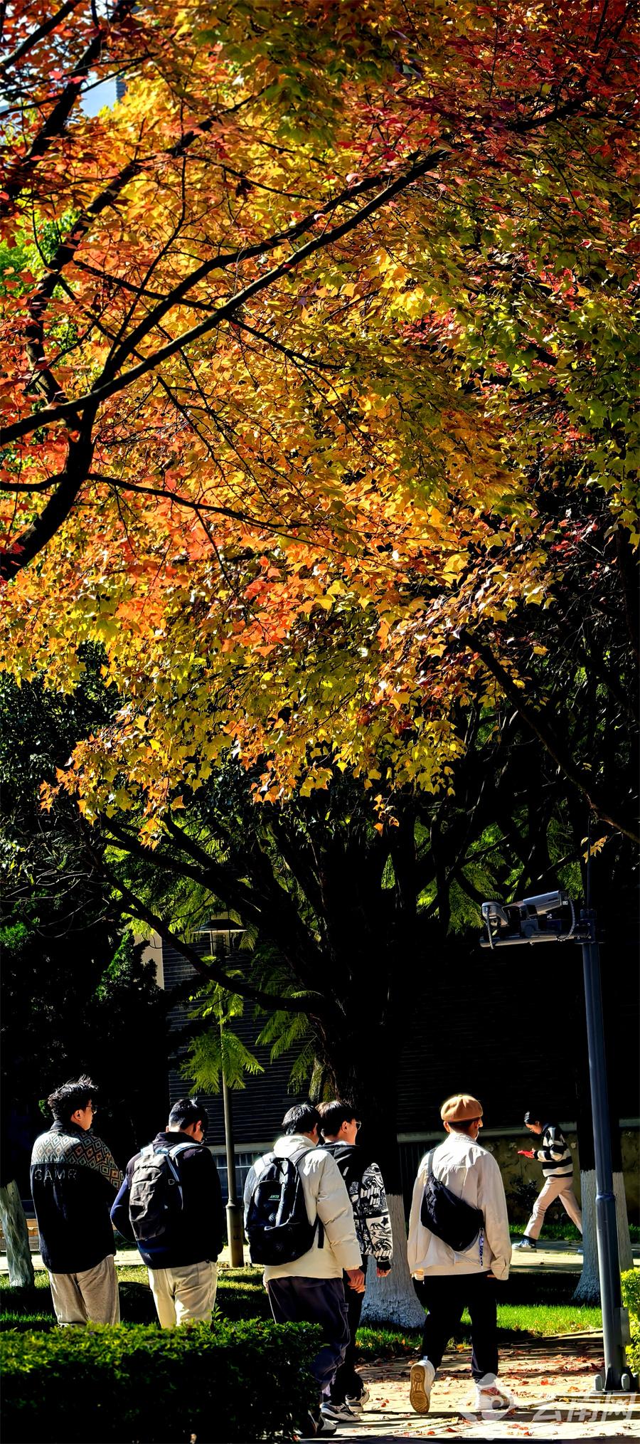 蓝得透彻的天空宛如一块无瑕的宝石,将阳光尽情洒向校园的每个角落。银杏树在冬日的光影中披上一身耀眼的金黄,微风掠过,叶片轻轻摇曳,仿佛在诉说时光的故事。那一树树火红的枫叶,就像燃烧的火焰,为这个季节增添了热情与生机,仿佛每一片叶子都盛满了热烈的情感。那一簇簇的火红仿佛凝聚了秋日的最后余韵,在冬天尽情绽放。 穿行在校园中,脚下是厚厚一层落叶铺成的地毯,耳畔是风儿轻拂枝叶的低语,目光所及皆是自然的恩赐。北潭的水面平静如镜,偶有微澜荡开天鹅的倒影。几只慵懒的黑天鹅在水中游弋,优雅的身姿为这片静谧的天地添上几分灵动。
