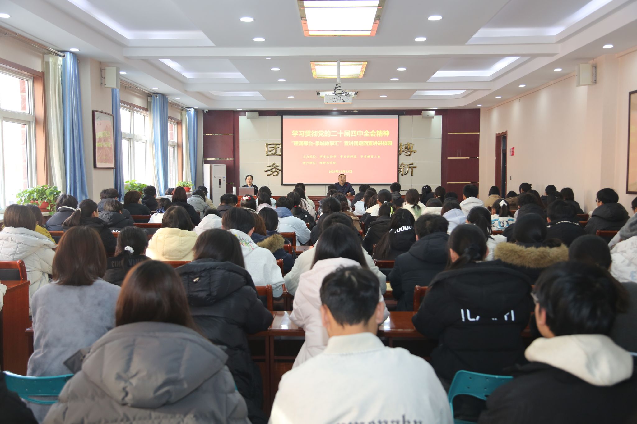 12月23日,由市委宣传部、市委讲师团、市委教育工委主办,开元承办的“理润邢台·泉城故事汇”巡回宣讲活动在图北会议中心举行,市委宣传部有关负责同志、临床医学系、中医系、口腔医学系、医疗技术系学生代表100余人参加,组织宣传统战部副部长姜桂勇主持。李宁艳老师作宣讲本次活动采取“双讲师”联动宣讲模式,分上下两个半场组织。上半场,“理润邢台·泉城故事汇”宣讲团成员、开元马克思主义学院概论教研室党支部书记、主任李宁艳副教授以《...